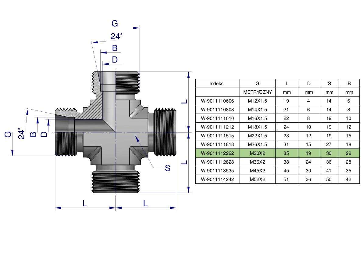 Czwórnik hydrauliczny metryczny BBBB M30x2 22L Waryński. Elementy złączne zostały zaprojektowane i wykonane zgodnie z obowiązującymi normami, które szczegółowo opisują wymagania jakościowe i wymiarowe. Są kompatybilne z elementami złącznymi innych renomowach producentów hydrauliki siłowej.