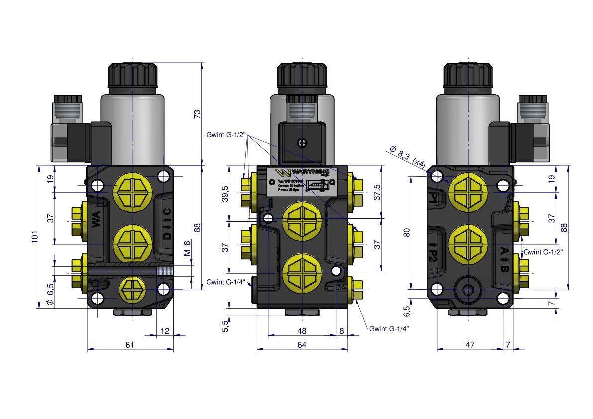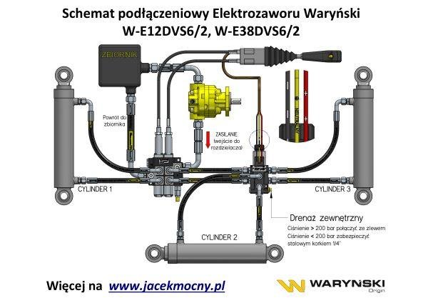Dzielnik (elektrozawór) kierunkowy elektromagnetyczny kontroli W-E12DVS6/2 (1/2″, 12V) 50L Waryński. W komplecie: wtyczka do cewki z diodą x 1szt, śruby montażowe x2szt, korek 1/4″ x 1szt, schemat podłączeniowy (ulotka) x 1szt. Elektrozawory posiadają wejście na drenaż zewnętrzny (przyłącze 1/4″). Przy ciśnieniu roboczym wyższym niż 200 bar należy połączyć ze zbiornikiem. Jeżeli ciśnienie robocze będzie niższe niż 200 bar przykręcamy stalowy korek 1/4″ z dostarczonego zestawu.