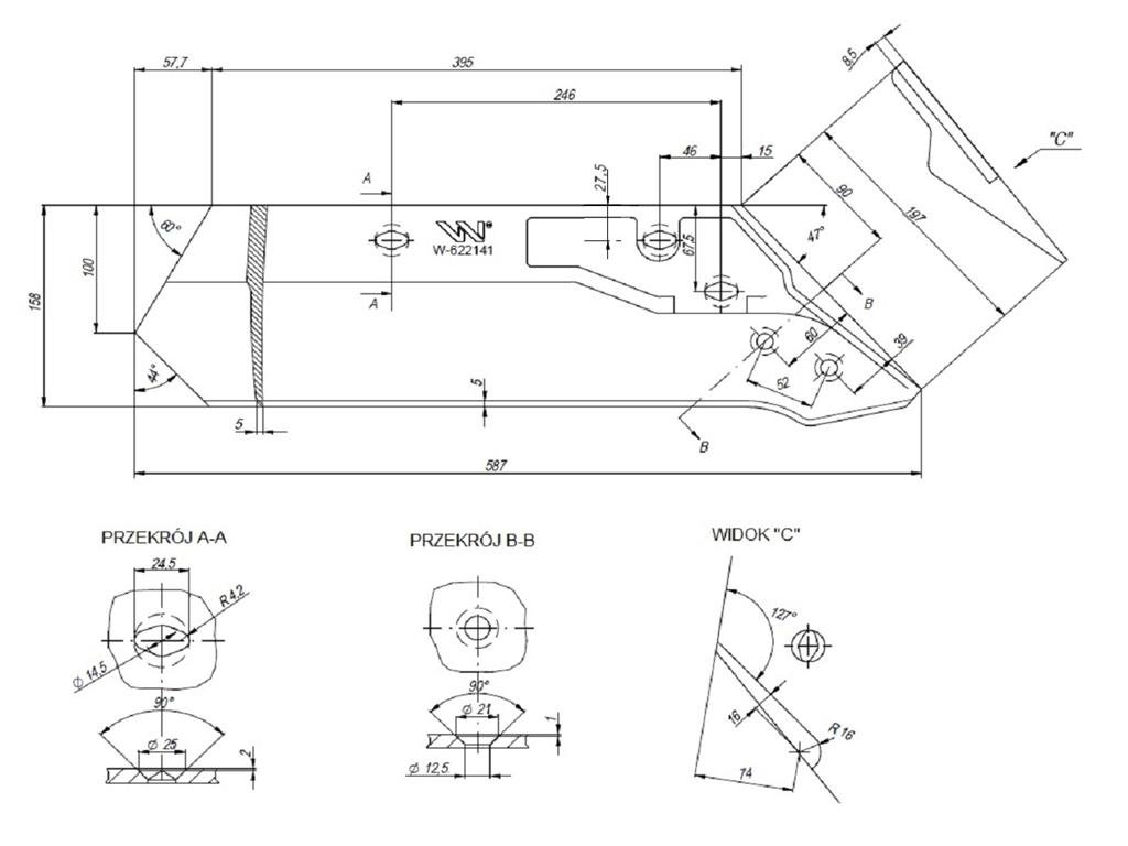 ŚRUBY WSPÓŁPRACUJĄCE:3 x W-173121435Eurolemiesz lewy 14″ 622141 zastosowanie Kuhn Losange WARYŃSKI Części robocze marki WARYŃSKI wykonane są z niezwykle wytrzymałej i odpornej na ścieranie stali borowej pochodzącej z europejskich hut. Każda, nawet najmniejsza dostawa, posiada dołączony certyfikat potwierdzający skład materiałowy. Stal borowa posiada właściwości szczególnie przydatne w zastosowaniach konstrukcyjnych wymagających dużej wytrzymałości. Połączenie wysokogatunkowej stali borowej, monitorowanego procesu obróbki cieplnej oraz skrupulatna kontrola jakości produktów WARYŃSKI to gwarancja wydłużonego okresu eksploatacji. Produkty WARYŃSKI to oszczędność kosztów związanych z powolnym ścieraniem i zużyciem części roboczych. W trosce o trwałość naszych produktów oraz zadowolenie klientów proces produkcji lemieszy WARYŃSKI nie zakłada operacji spawania. Wszystkie rodzaje otworów są wykonane w specjalny sposób minimalizujący naprężenia oraz zmniejszający ryzyko pęknięć.