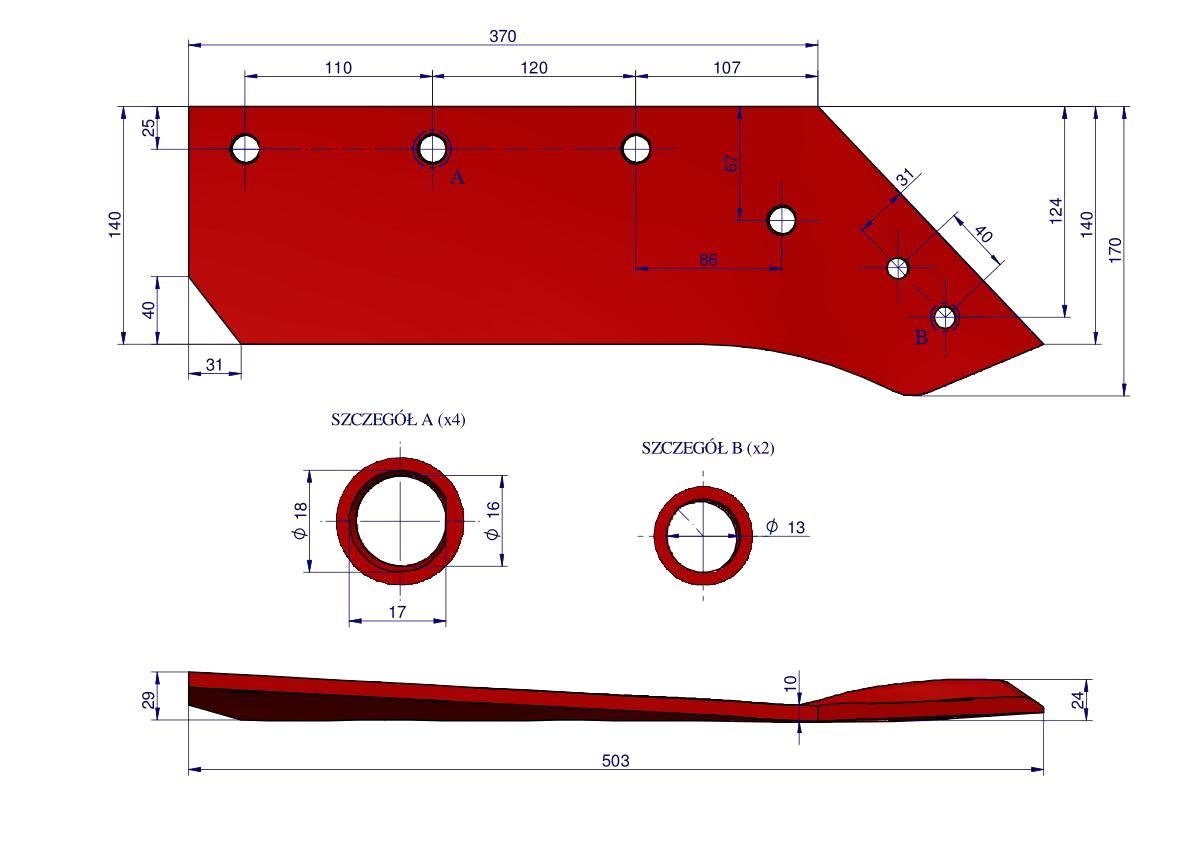 ŚRUBY WSPÓŁPRACUJĄCE:4 x W-211121434Eurolemiesz prawy 14″ zastosowanie Kverneland Pług stal borowa WARYŃSKI Części robocze marki WARYŃSKI wykonane są z niezwykle wytrzymałej i odpornej na ścieranie stali borowej pochodzącej z europejskich hut. Każda, nawet najmniejsza dostawa, posiada dołączony certyfikat potwierdzający skład materiałowy. Stal borowa posiada właściwości szczególnie przydatne w zastosowaniach konstrukcyjnych wymagających dużej wytrzymałości. Połączenie wysokogatunkowej stali borowej, monitorowanego procesu obróbki cieplnej oraz skrupulatna kontrola jakości produktów WARYŃSKI to gwarancja wydłużonego okresu eksploatacji. Produkty WARYŃSKI to oszczędność kosztów związanych z powolnym ścieraniem i zużyciem części roboczych. W trosce o trwałość naszych produktów oraz zadowolenie klientów proces produkcji lemieszy WARYŃSKI nie zakłada operacji spawania. Wszystkie rodzaje otworów są wykonane w specjalny sposób minimalizujący naprężenia oraz zmniejszający ryzyko pęknięć.