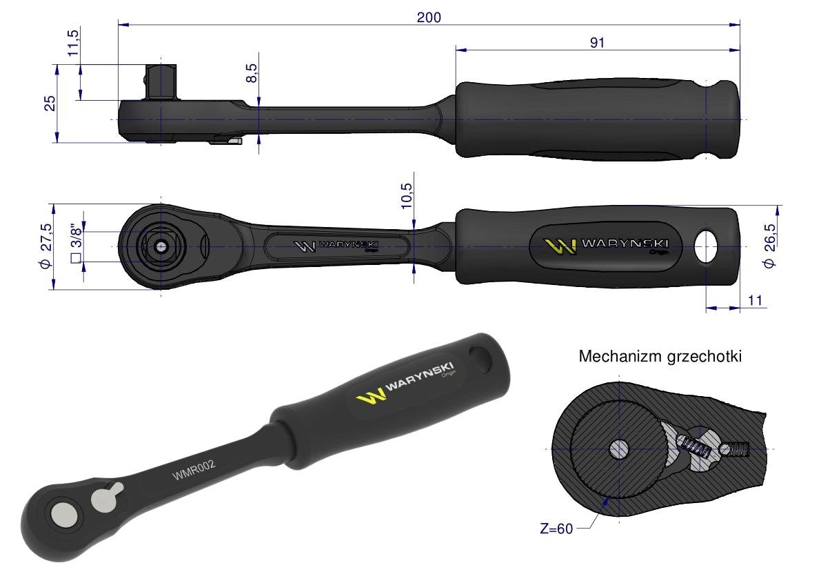 Grzechotka 3/8″. 60 T. o zwiększonej odporności. Waryński [WMR002]
