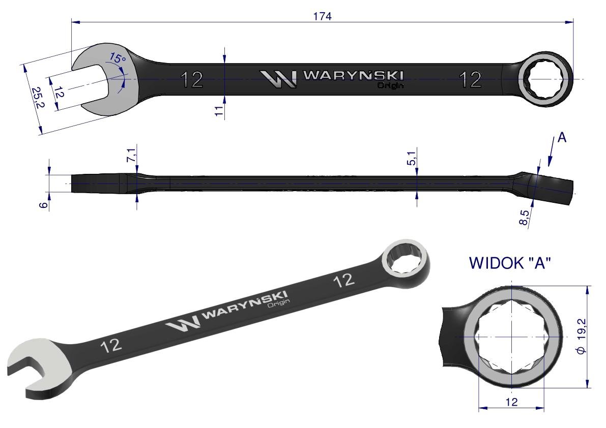 Klucz płasko-oczkowy 12 mm. CrV standard ASME B107-2010 Waryński [WMK022]