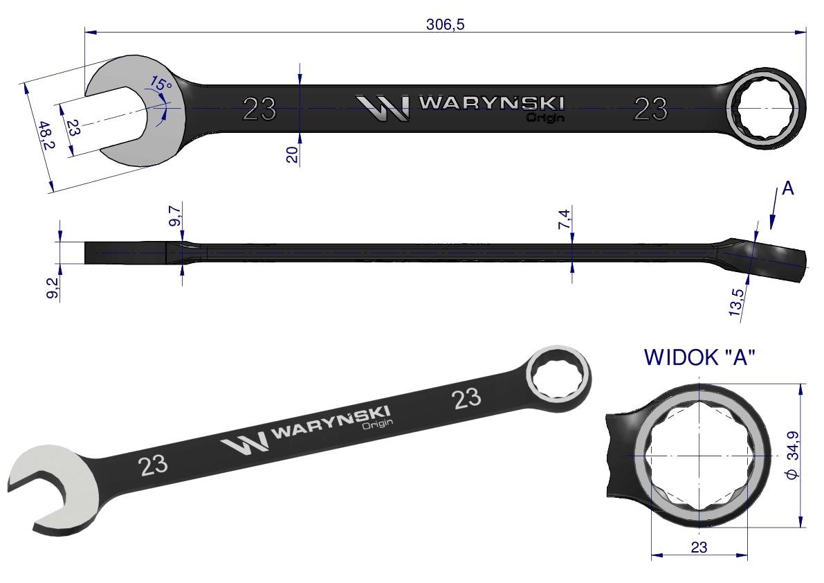 Klucz płasko-oczkowy 23 mm. CrV standard ASME B107-2010 Waryński [WMK033]