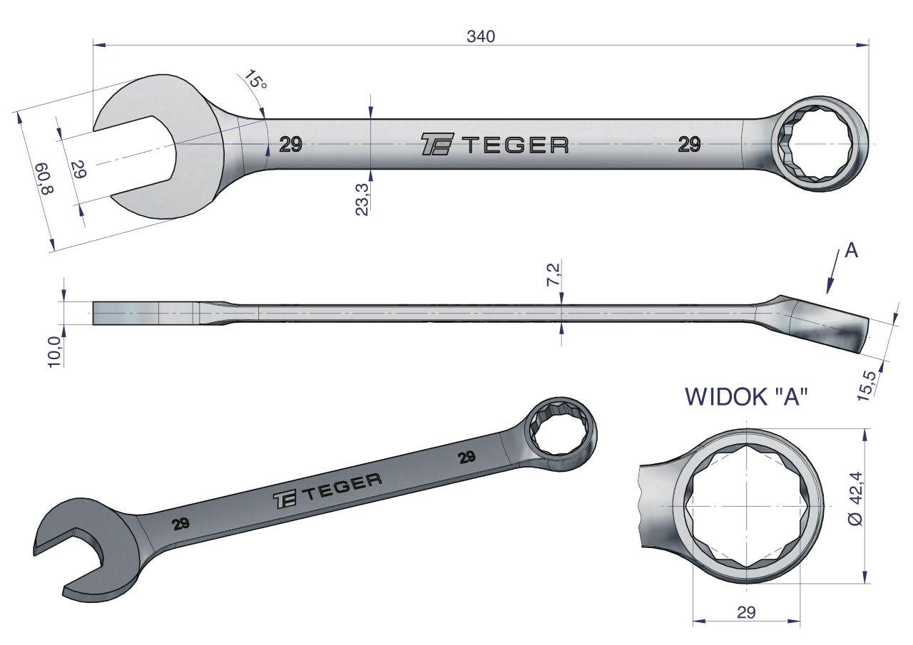 Klucz płasko-oczkowy 29 mm / TEGER wykonany ze stopu stali chromowo-wanadowej CRV, wytrzymałej na naprężenie statyczne i kinetyczne. Unikalna powłoka na powierzchni znacząco zwiększa komfort pracy oraz pozwala na utrzymanie narzędzi w czystości. Klucz kuty matrycowo, odpory na odkształcenia doskonale wykalibrowany. Dwunastokątna końcówka klucza oczkowego, dodatkowo odgięta ułatwia manewrowanie kluczem. Przeznaczony do prac nawet w najcięższych warunkach pod dużym obciążeniem