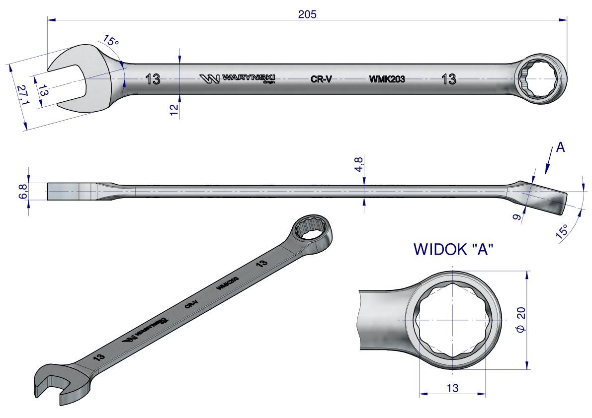 Klucz płaskooczkowy 13 mm przedłużony do 205 mm standard ASME B107.9M Waryński
