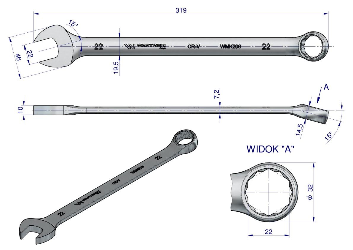 Klucz płaskooczkowy extra długi 22mm dł 319mm standard ASME B107.9M Waryński [WMK206]