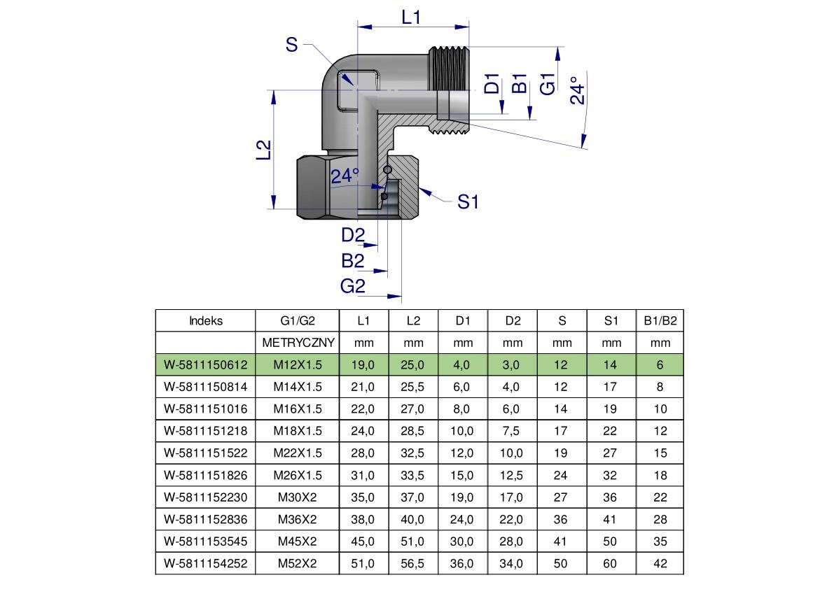 Kolanko hydrauliczne metryczne AB M12x1.5 06L (XEVW) Waryński. Elementy złączne zostały zaprojektowane i wykonane zgodnie z obowiązującymi normami, które szczegółowo opisują wymagania jakościowe i wymiarowe. Są kompatybilne z elementami złącznymi innych renomowach producentów hydrauliki siłowej.