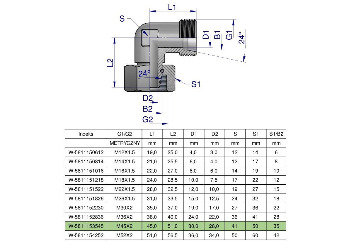 Kolanko hydrauliczne metryczne AB M45x2 35L (XEVW) Waryński [W-5811153545]