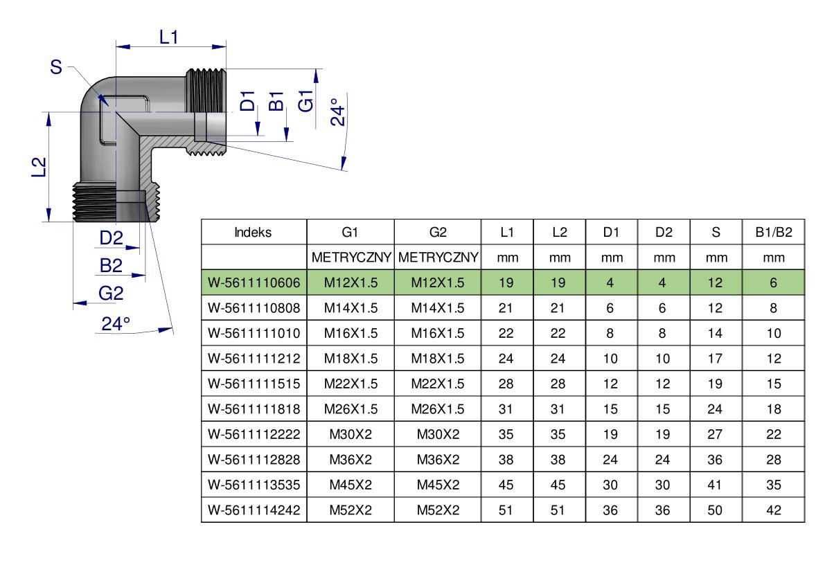 Kolanko hydrauliczne metryczne BB M12x1.5 06L (XW) Waryński ( sprzedawane po 5 ) [W-5611110606]