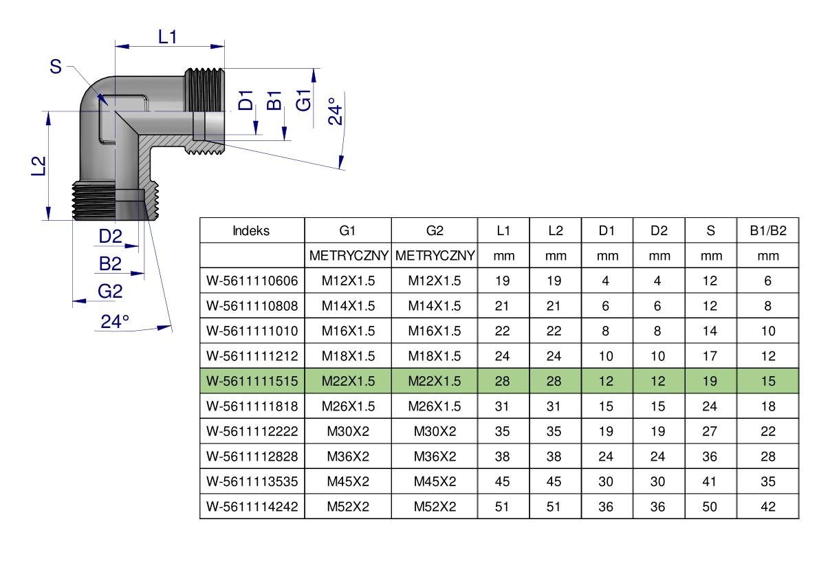 Kolanko hydrauliczne metryczne BB M22x1.5 15L (XW) Waryński ( sprzedawane po 5 ) [W-5611111515]