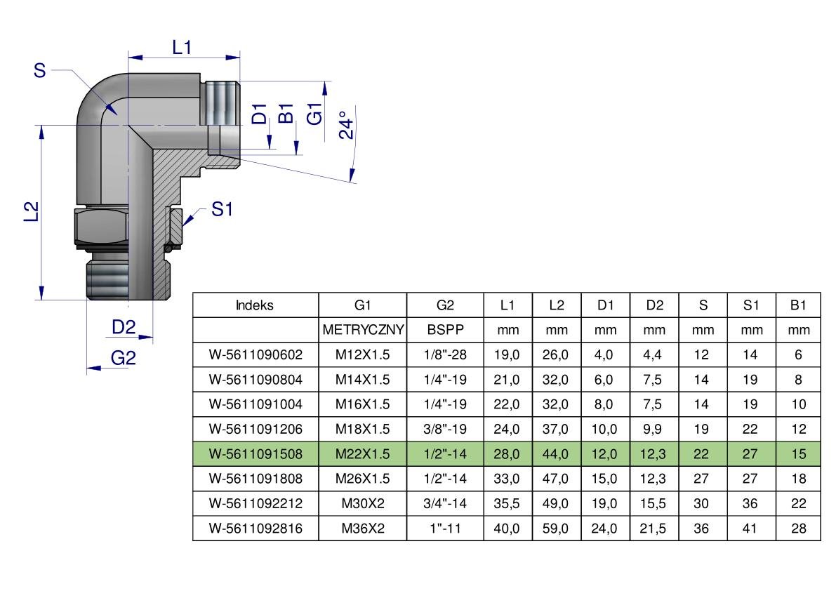Kolanko hydrauliczne nastawne BB M22x1.5 15L x 1/2″BSP z regulacją Waryński. Elementy złączne zostały zaprojektowane i wykonane zgodnie z obowiązującymi normami, które szczegółowo opisują wymagania jakościowe i wymiarowe. Są kompatybilne z elementami złącznymi innych renomowach producentów hydrauliki siłowej.