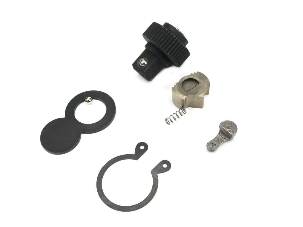 Komplet naprawczy do grzechotki 1/4 WMR013 Waryński złożony z koła zębatki głównej z kulką, zębatej kształtki roboczej, pierścienia zabezpieczającego, dźwigni zmiany kierunku, spreżynki, pierścienia mocującego segera