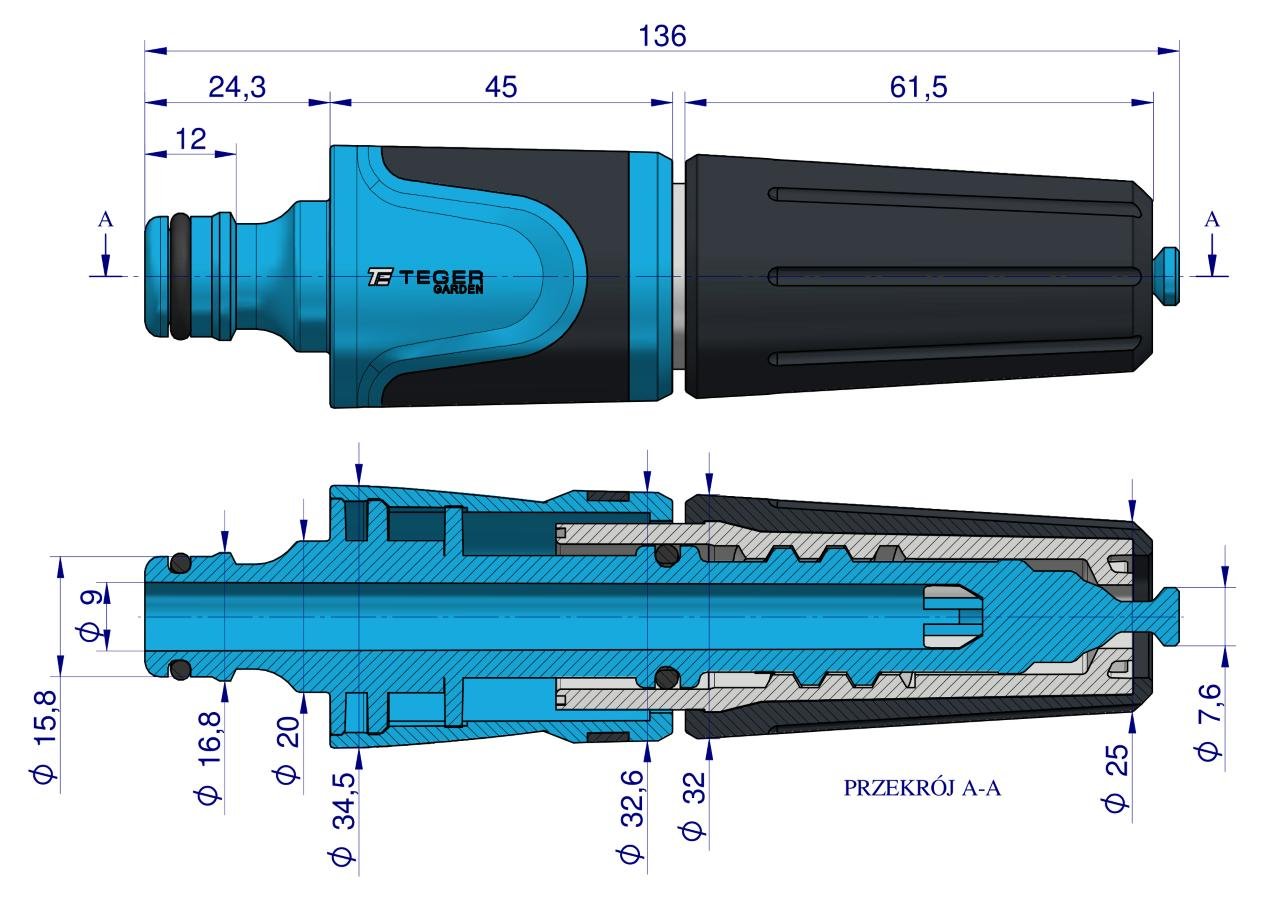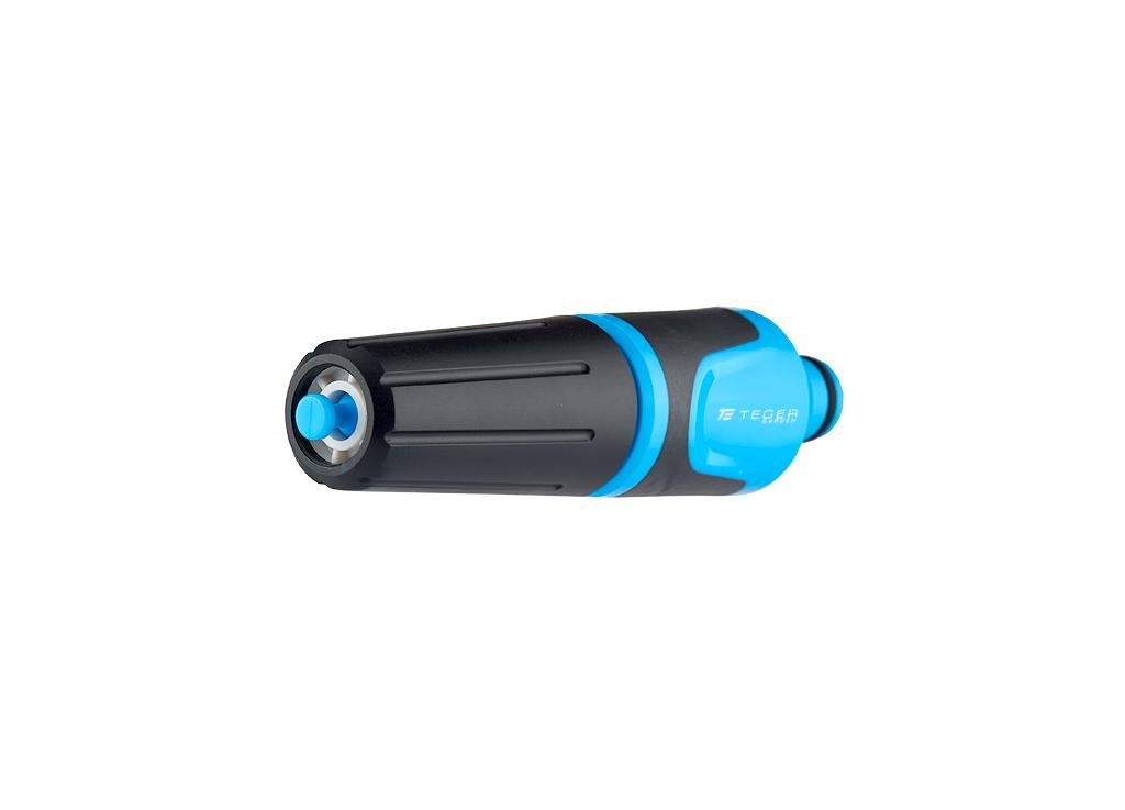 Końcówka natryskowa – regulowana / TEGER / Wysokiej jakości dysza zraszająca wykonana z tworzywa ABS pokrytego gumą termoplastyczną (TPR) gwarantuje wygodną obsługę. Bezstopniowa regulacja strumienia wody, od punktowego do delikatnej mżawki sprawdzi się nie tylko w ogrodzie, lecz także w gospodarstwie domowym. Idealna do powierzchniowego drobnokroplistego nawadniania grządek.