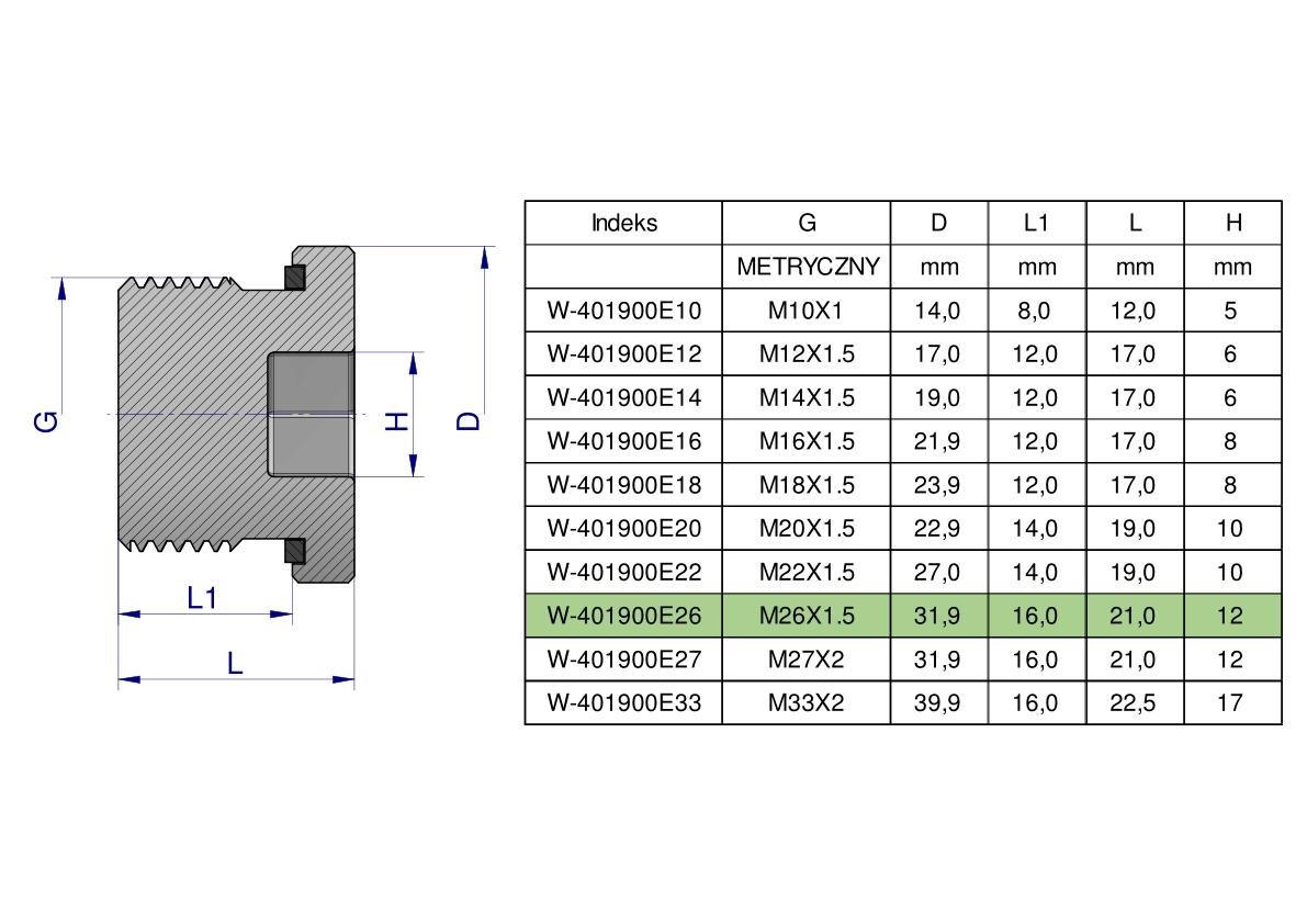 Korek hydrauliczny metryczny (na imbus) M26x1.5 ED Waryński. Elementy złączne zostały zaprojektowane i wykonane zgodnie z obowiązującymi normami, które szczegółowo opisują wymagania jakościowe i wymiarowe. Są kompatybilne z elementami złącznymi innych renomowach producentów hydrauliki siłowej.