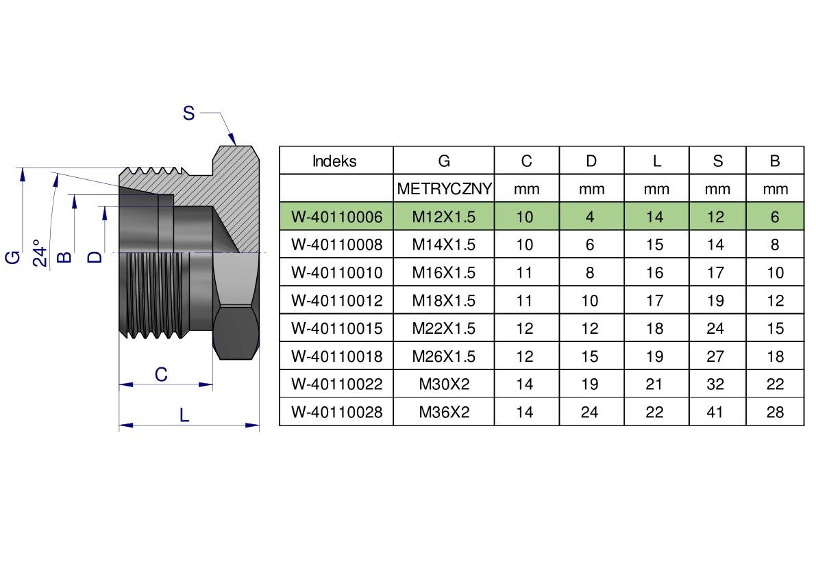 Korek hydrauliczny metryczny (na klucz) M12x1.5 06L Waryński. Elementy złączne zostały zaprojektowane i wykonane zgodnie z obowiązującymi normami, które szczegółowo opisują wymagania jakościowe i wymiarowe. Są kompatybilne z elementami złącznymi innych renomowach producentów hydrauliki siłowej.