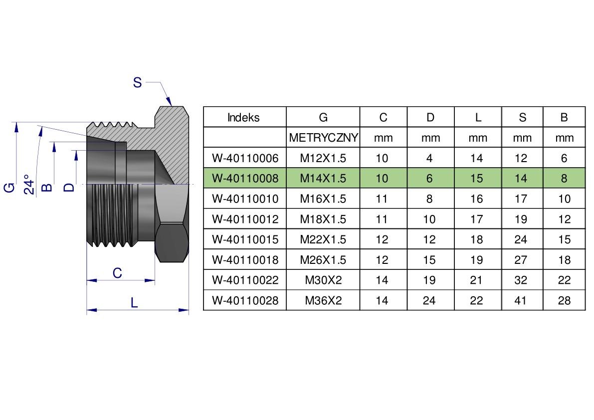 Korek hydrauliczny metryczny (na klucz) M14x1.5 08L Waryński. Elementy złączne zostały zaprojektowane i wykonane zgodnie z obowiązującymi normami, które szczegółowo opisują wymagania jakościowe i wymiarowe. Są kompatybilne z elementami złącznymi innych renomowach producentów hydrauliki siłowej.