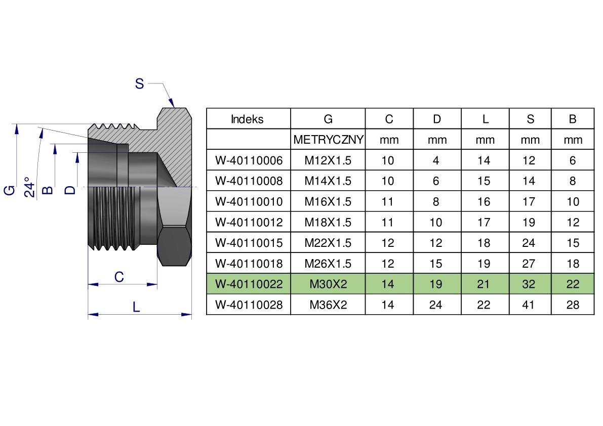 Korek hydrauliczny metryczny (na klucz) M30x2 22L Waryński. Elementy złączne zostały zaprojektowane i wykonane zgodnie z obowiązującymi normami, które szczegółowo opisują wymagania jakościowe i wymiarowe. Są kompatybilne z elementami złącznymi innych renomowach producentów hydrauliki siłowej.