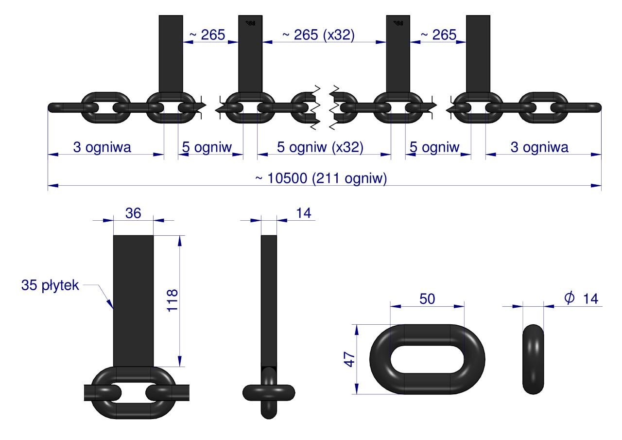 Łańcuch 35-l. 36x118x14 wsuwanych klasa 5 Rozrzutnik Tytan Waryński Łańcuch krótkoogniwowy kalibrowany 14×50 PN-G-46732-5 Klasa 5.
