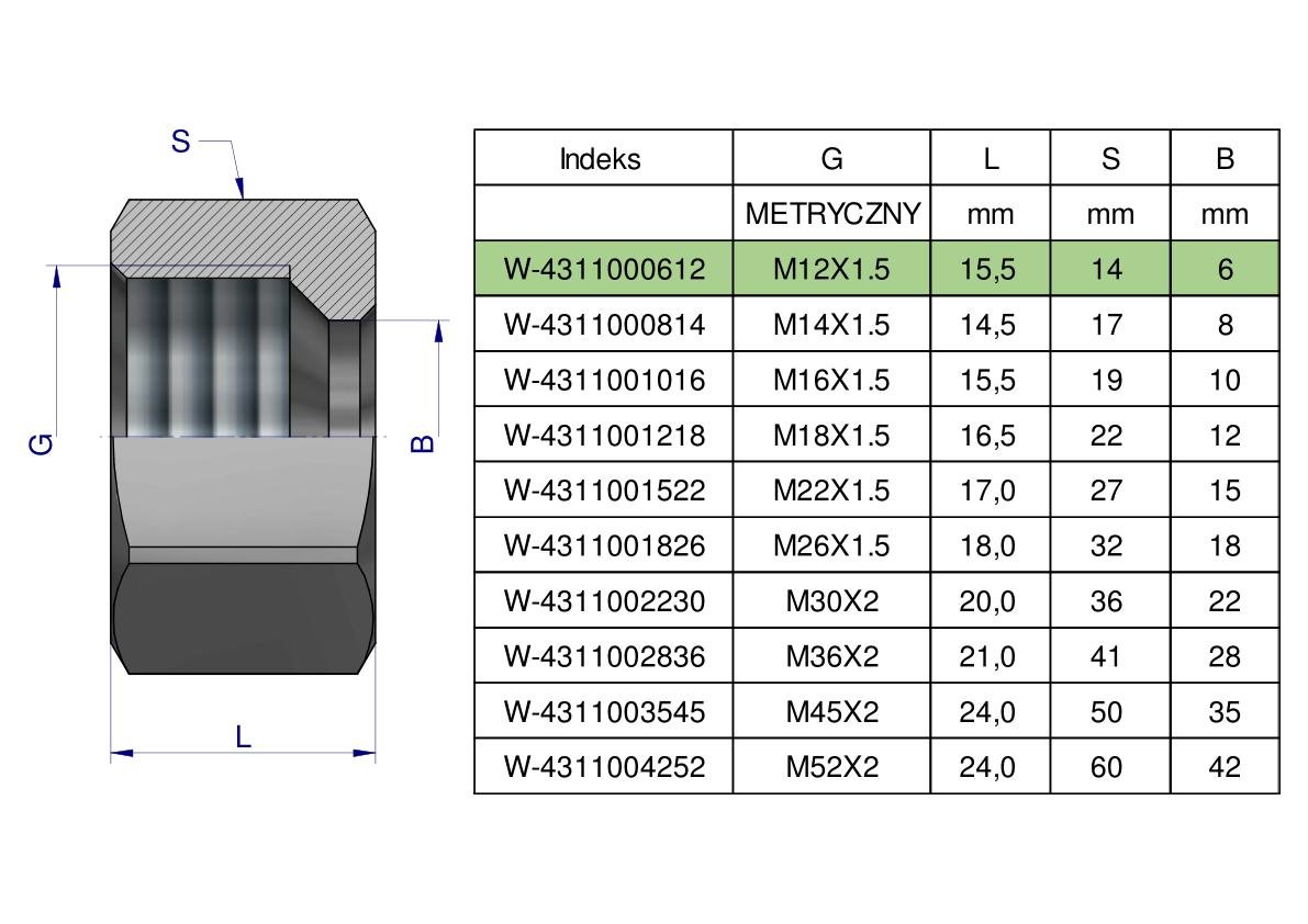 Nakrętka hydrauliczna metryczna (M06L) M12x1.5 06L Waryński. Elementy złączne zostały zaprojektowane i wykonane zgodnie z obowiązującymi normami, które szczegółowo opisują wymagania jakościowe i wymiarowe. Są kompatybilne z elementami złącznymi innych renomowach producentów hydrauliki siłowej.