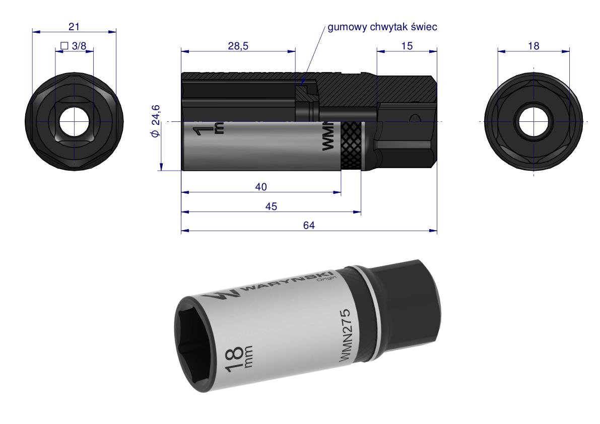 Nasadka do świec 3/8″. 18 mm. CrV50BV30. DIN 3124. Waryński [WMN275]