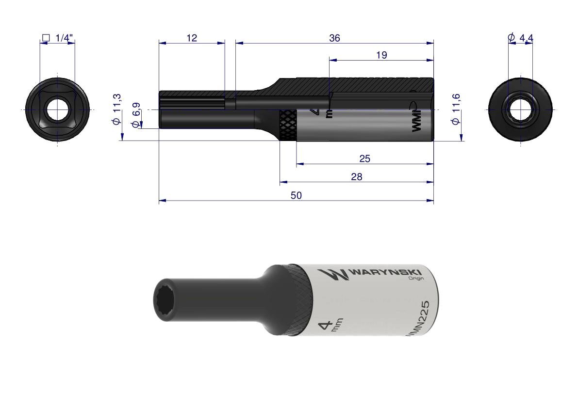 Nasadka dwunastokątna 1/4″. 4 mm. długa. CrV50BV30. DIN 3124. Waryński [WMN225]