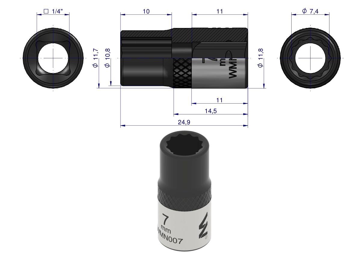 Nasadka dwunastokątna 1/4″. 7 mm. CrV50BV30. DIN 3124. Waryński