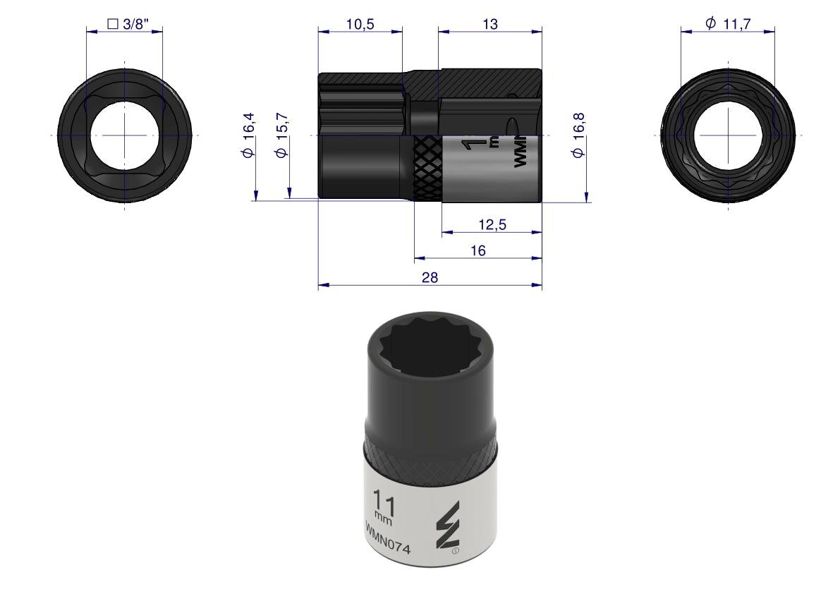 Nasadka dwunastokątna 3/8″. 11 mm. CrV50BV30. DIN 3124. Waryński