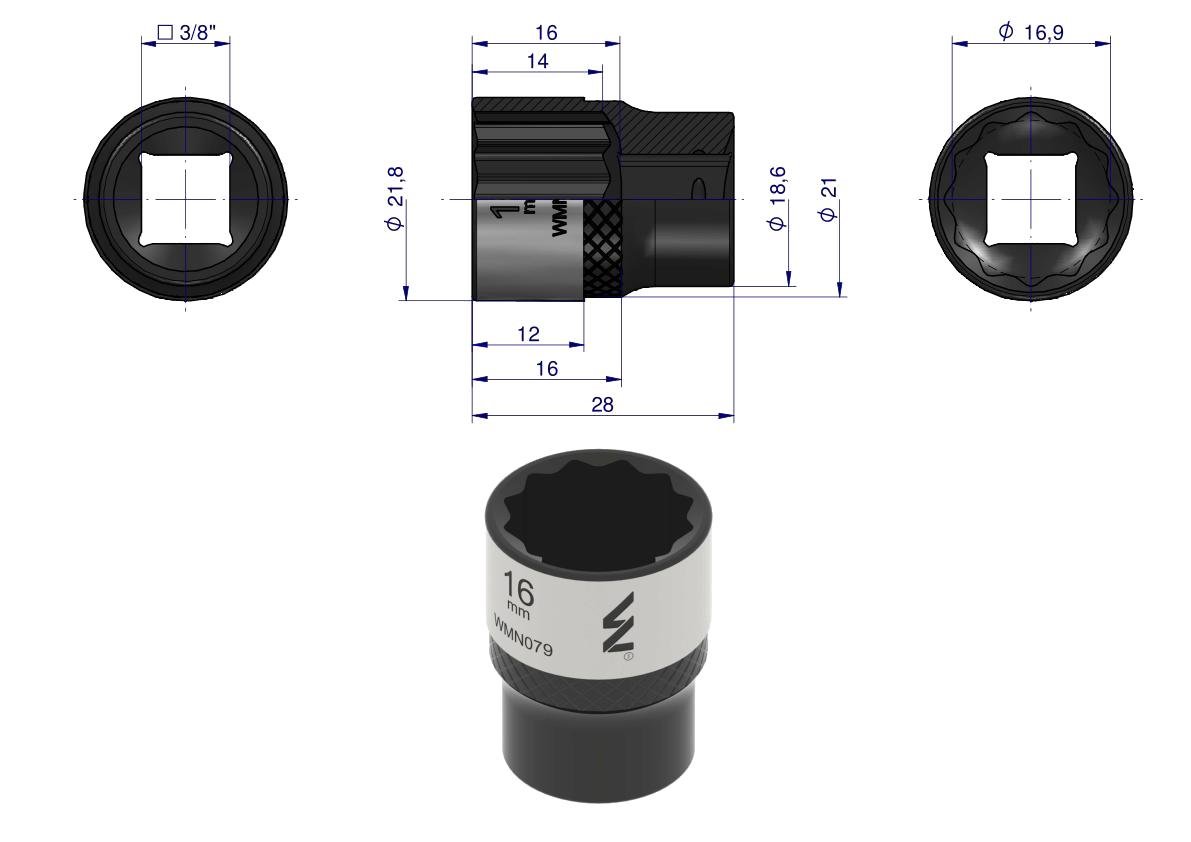 Nasadka dwunastokątna 3/8″. 16 mm. CrV50BV30. DIN 3124. Waryński