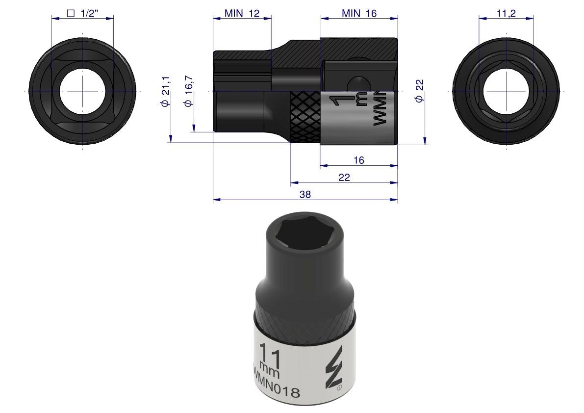 Nasadka sześciokątna 1/2″. 11 mm. CrV50BV30. DIN 3124. Waryński [WMN018]