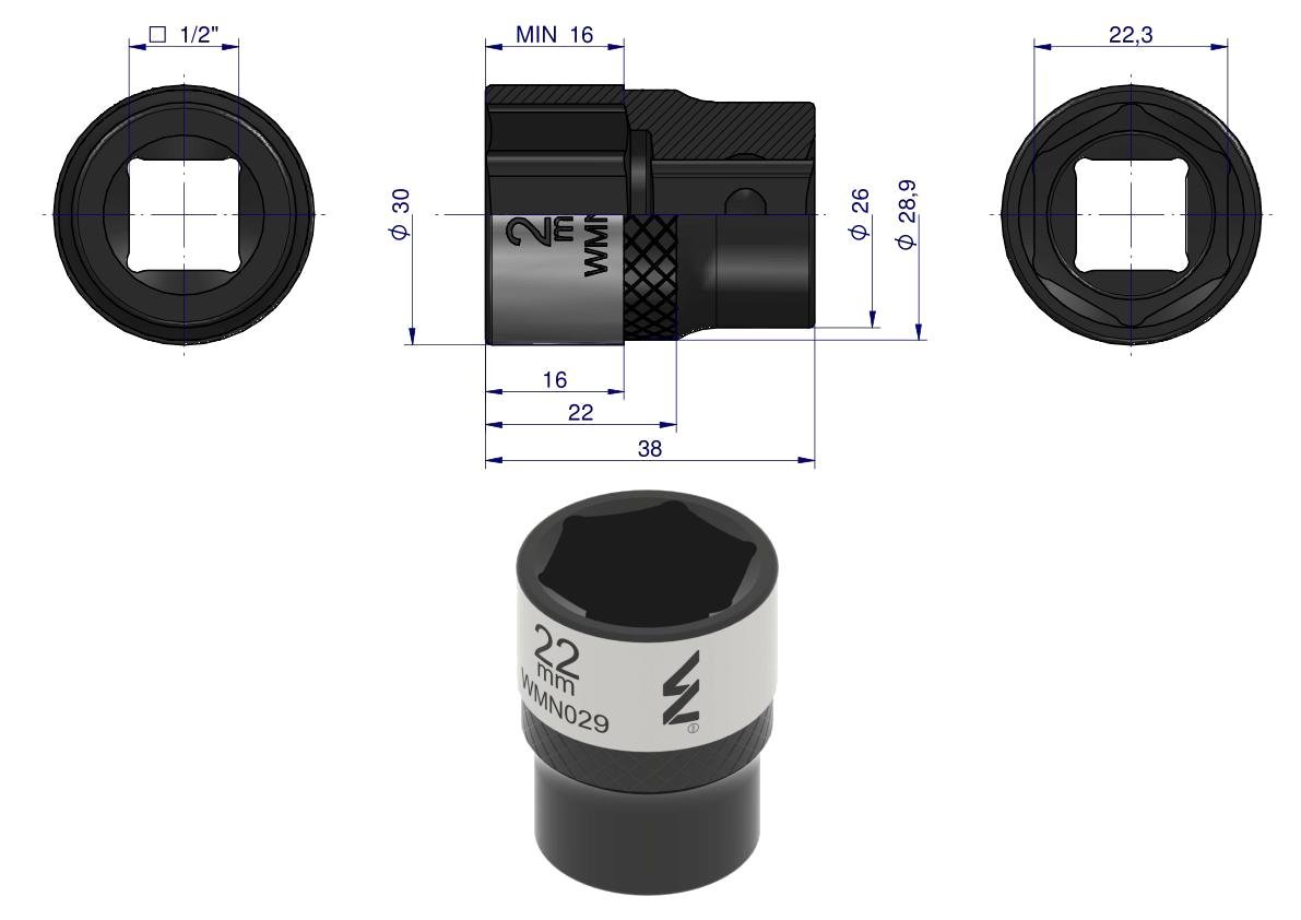 Nasadka sześciokątna 1/2″. 22 mm. CrV50BV30. DIN 3124. Waryński [WMN029]