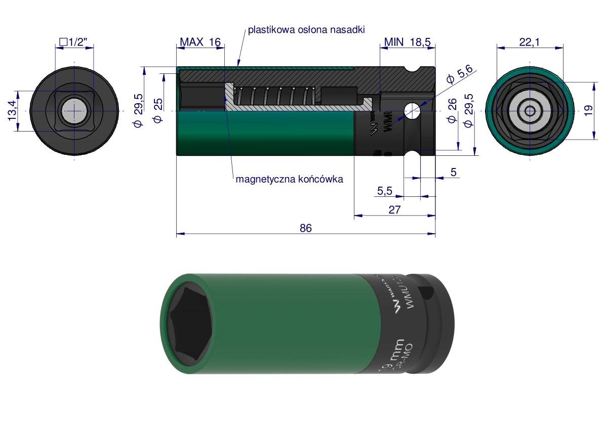 Nasadka udarowa 1/2 z magnesem do felg aluminiowych 19mm. Waryński