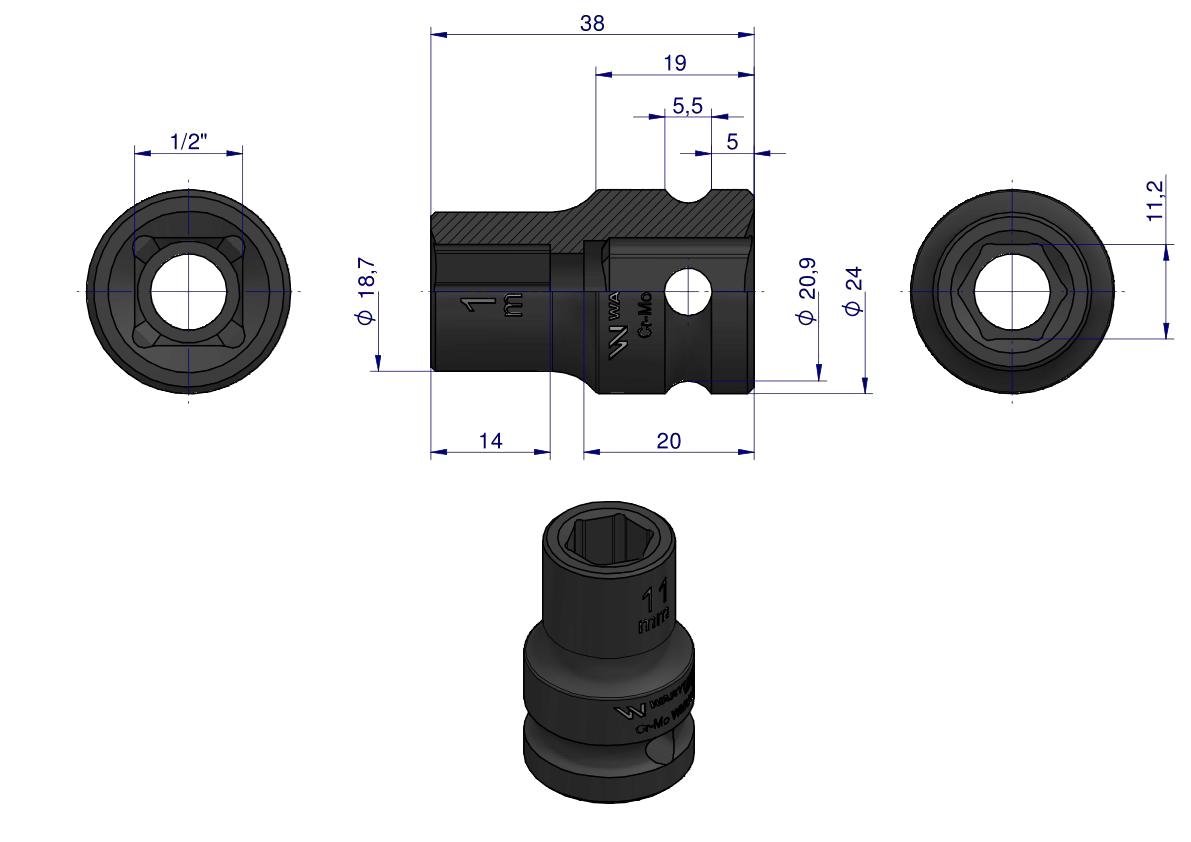 Nasadka udarowa sześciokątna 1/2″. 11 mm. CrMo. DIN 3129. Waryński
