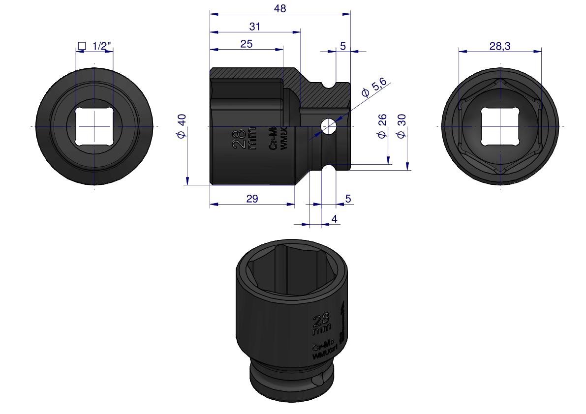 Nasadka udarowa sześciokątna 1/2″. 28 mm. CrMo. DIN 3129. Waryński