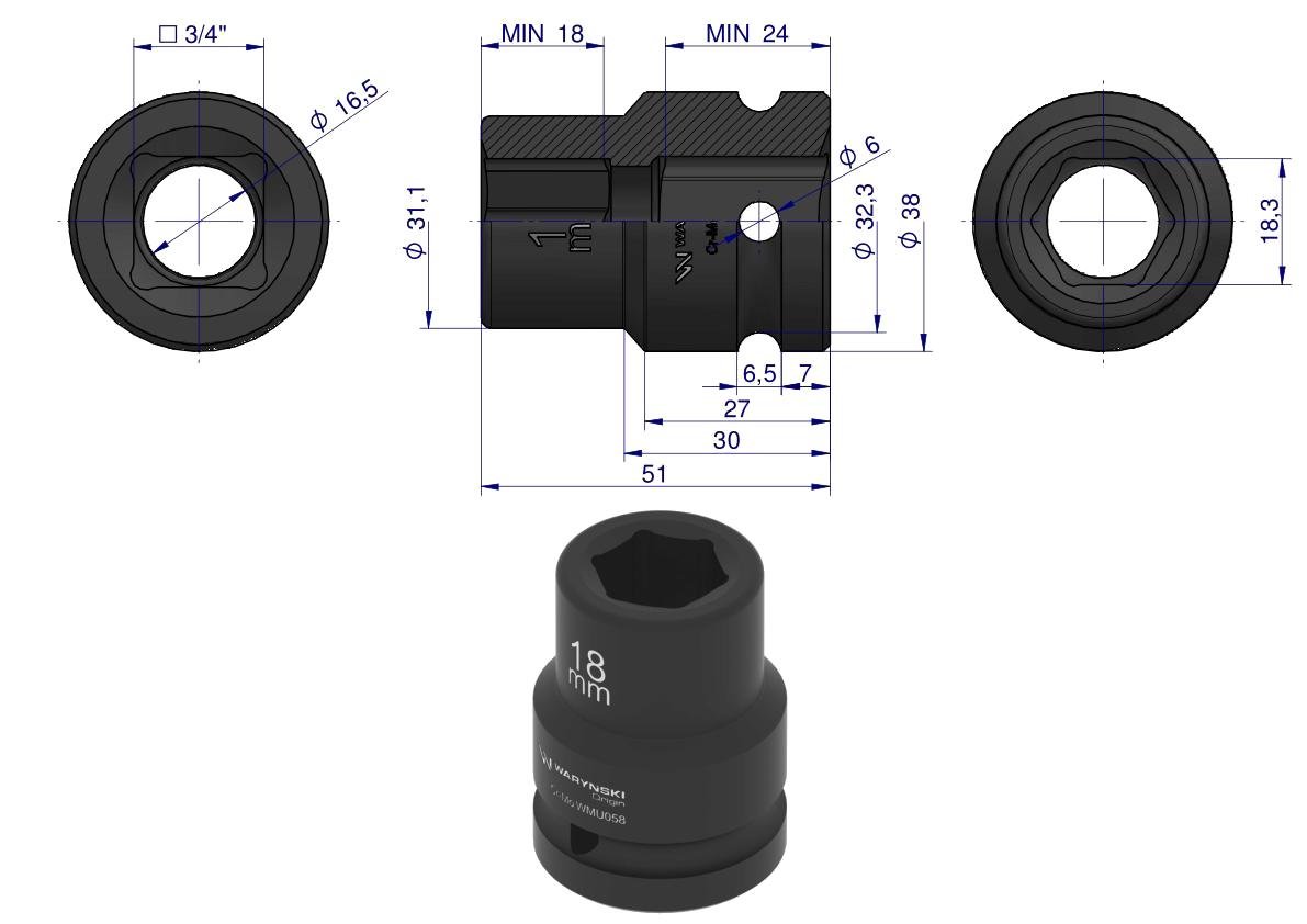 Nasadka udarowa sześciokątna 3/4″. 18 mm. CrMo. DIN 3129. Waryński [WMU058]