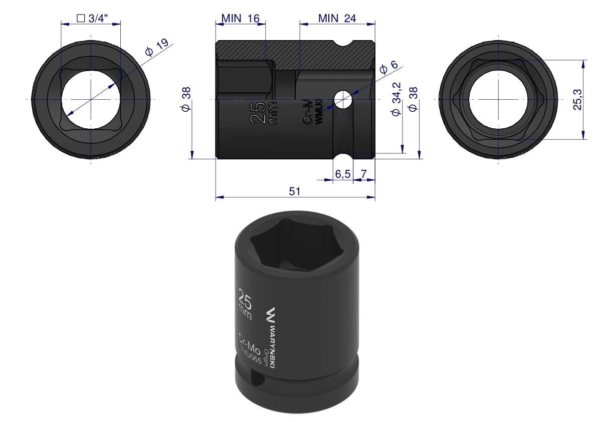 Nasadka udarowa sześciokątna 3/4″. 25 mm. CrMo. DIN 3129. Waryński