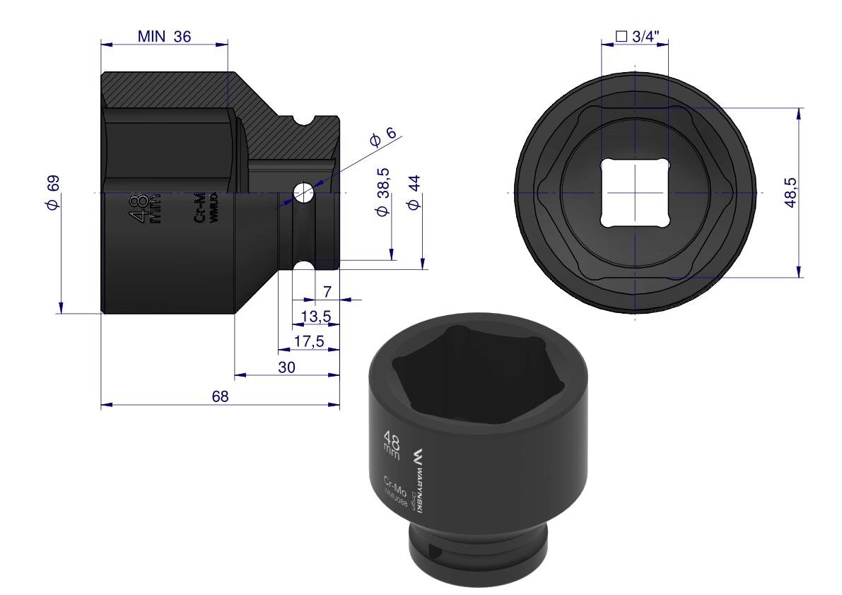 Nasadka udarowa sześciokątna 3/4″. 48 mm. CrMo. DIN 3129. Waryński