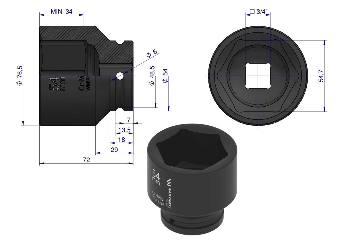 Nasadka udarowa sześciokątna 3/4″. 54 mm. CrMo. DIN 3129. Waryński [WMU094]