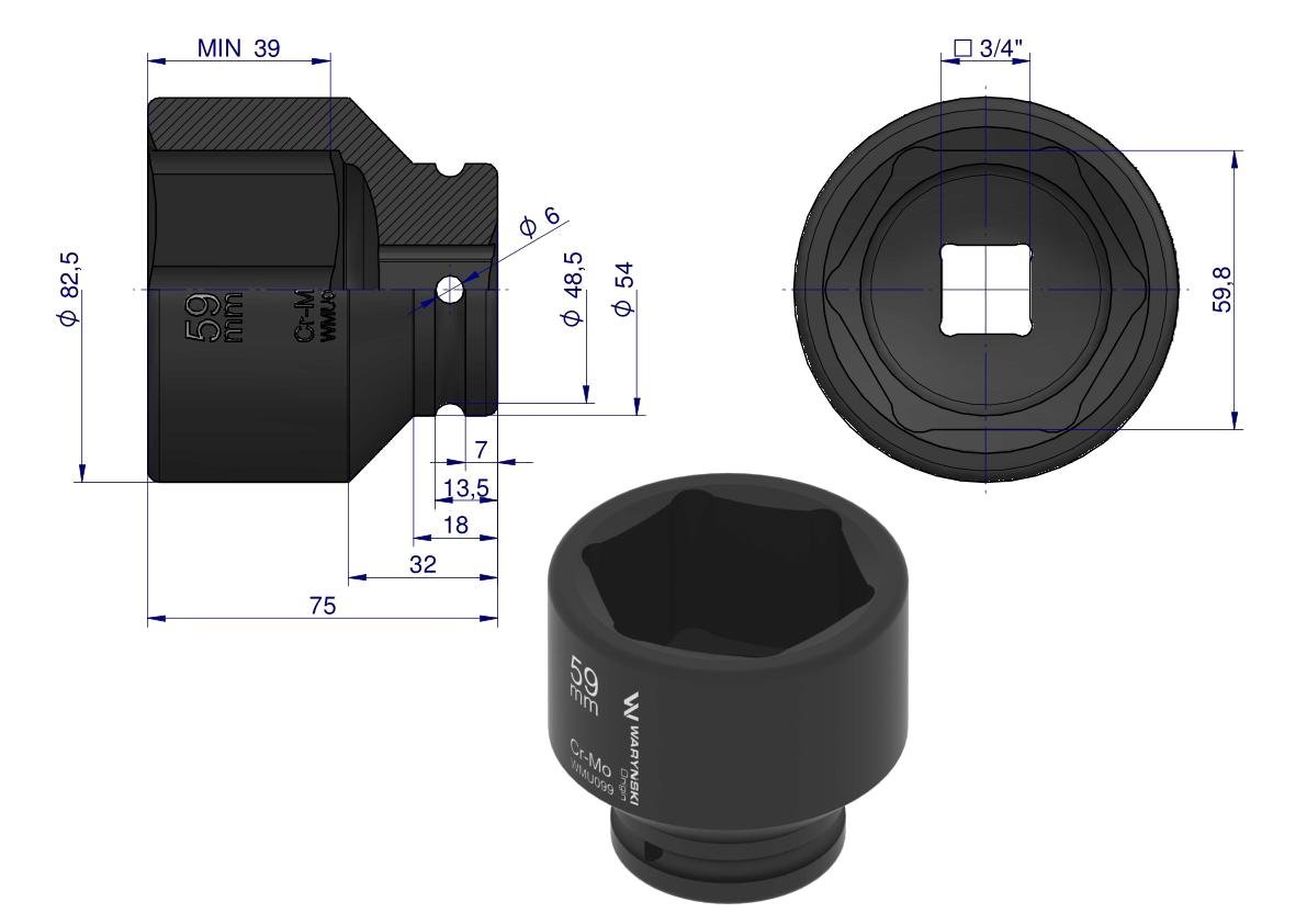 Nasadka udarowa sześciokątna 3/4″. 59 mm. CrMo. DIN 3129. Waryński [WMU099]