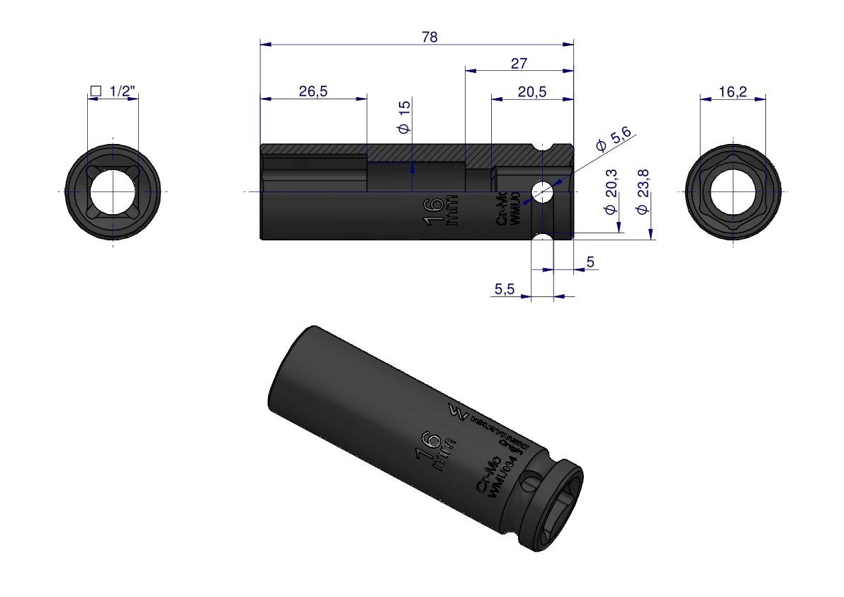 Nasadka udarowa sześciokątna długa 1/2″. 16 mm. CrMo. DIN 3129. Waryński [WMU034]