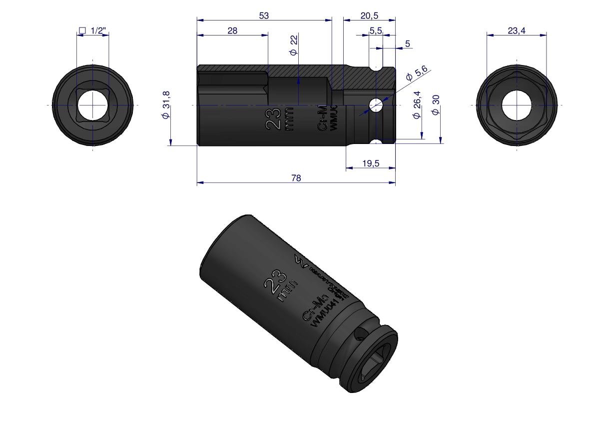 Nasadka udarowa sześciokątna długa 1/2″. 23 mm. CrMo. DIN 3129. Waryński [WMU041]