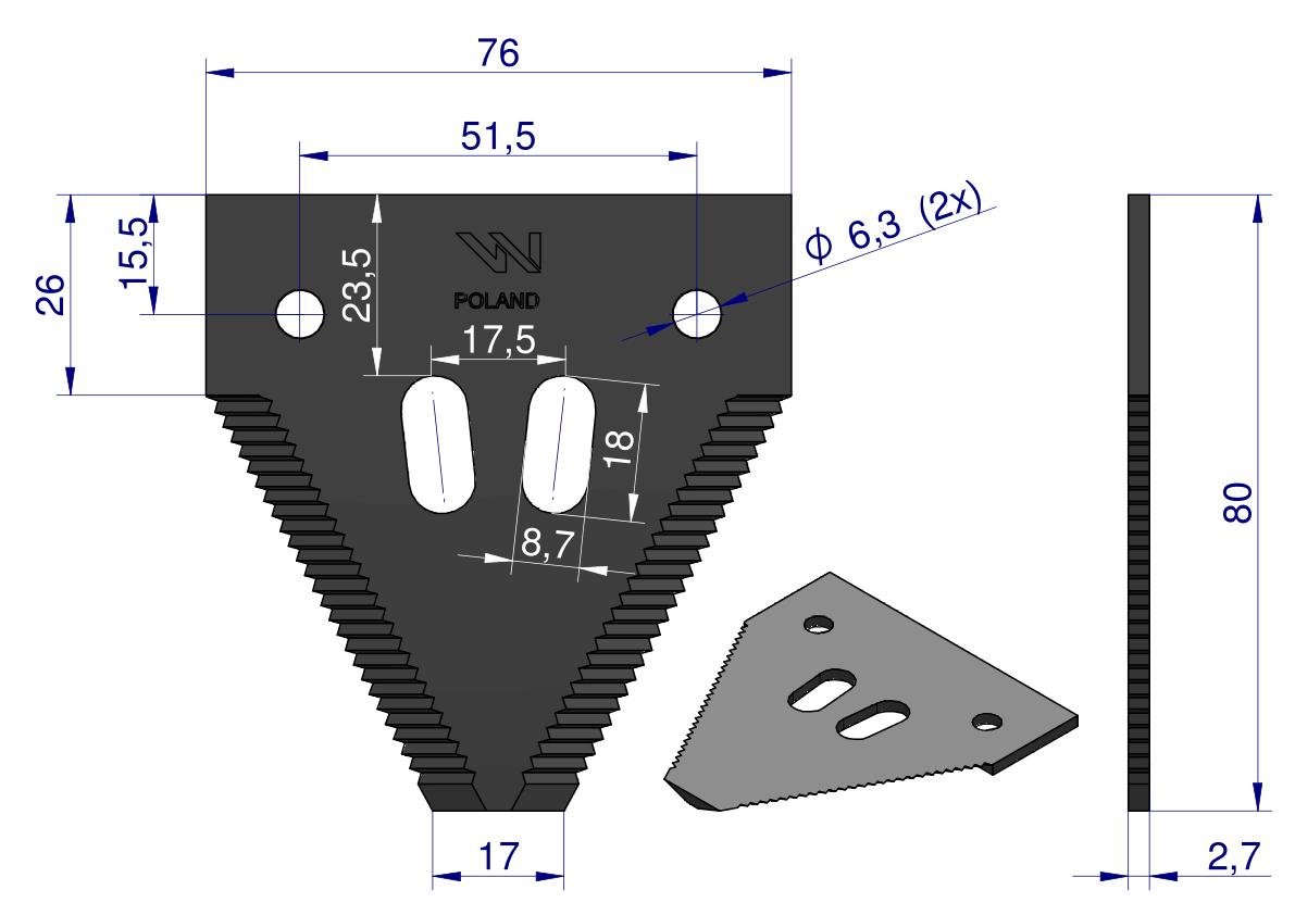 Nóż żniwny 80x76x2.7mm otwór 6.5 zastosowanie 1096606 420100046 Schumacher WARYŃSKI ( sprzedawane po 25 ) [WKZ80X76X2.7/1]