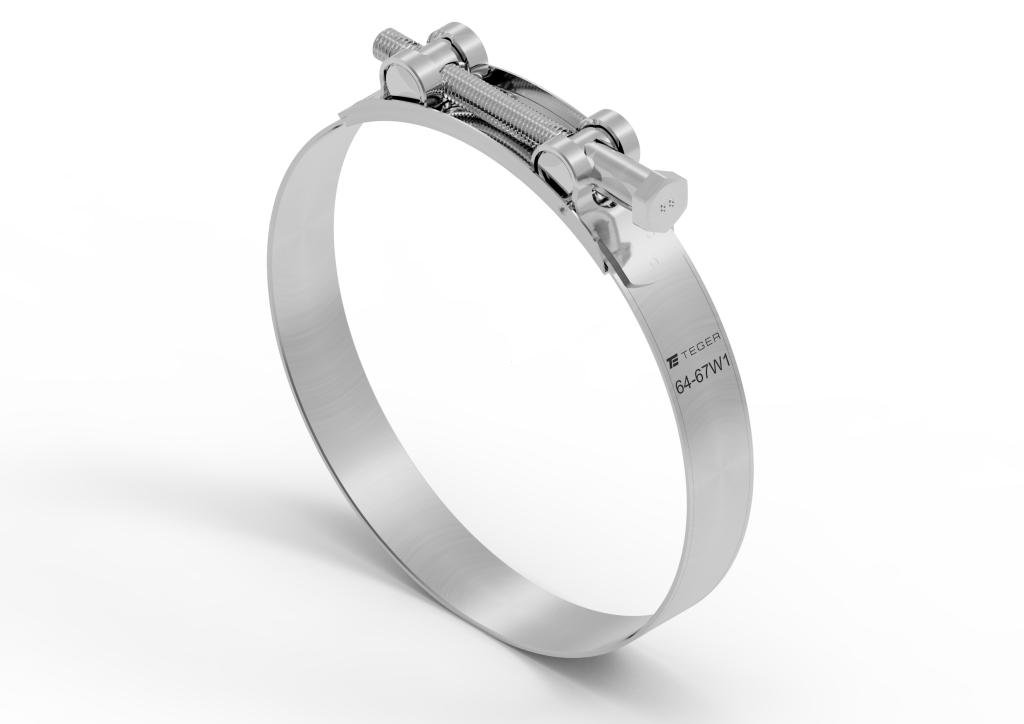 Opaska zaciskowa GBS 64-67 skręcana (obejma W1 – stal ocynkowana) szerkość 22mm TEGER. Skręcane śrubą z łbem sześciokątnym oraz dwoma sworzniami wewnętrznymi pełnymi. Dzięki czemu charakteryzują się zwiększoną siłą zacisku. Opaski zaciskowe GBS – łatwe w montażu: kluczyk, trwałe, duża siła zaciskająca.