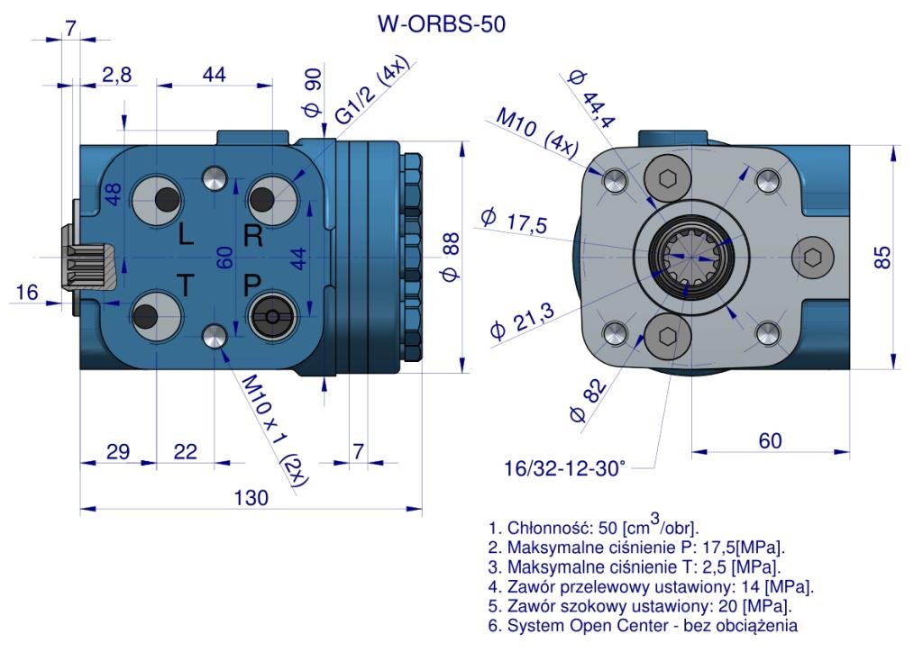 Hydrostatyczny zawór skrętu W-ORBS-50 (140 bar / max.175 bar) Waryński. Orbitrole serii W-ORBS mają zwartą i solidną konstrukcję, pozwalającą na lekką i płynną pracę układu kierowniczego. Wspomaganie odbywa się bez szarpania, nawet pod dużym obciążeniem. System open center (ON) non-reaction – w pozycji neutralnej pompa jest odciążona, olej swobodnie powraca na zbiornik, siły działające na koła nie wywołują żadnej reakcji. Wspomaganie hydrauliczne gwarantuje wysoką precyzję kierowania sprzętem przy zachowaniu niewielkiej awaryjności.