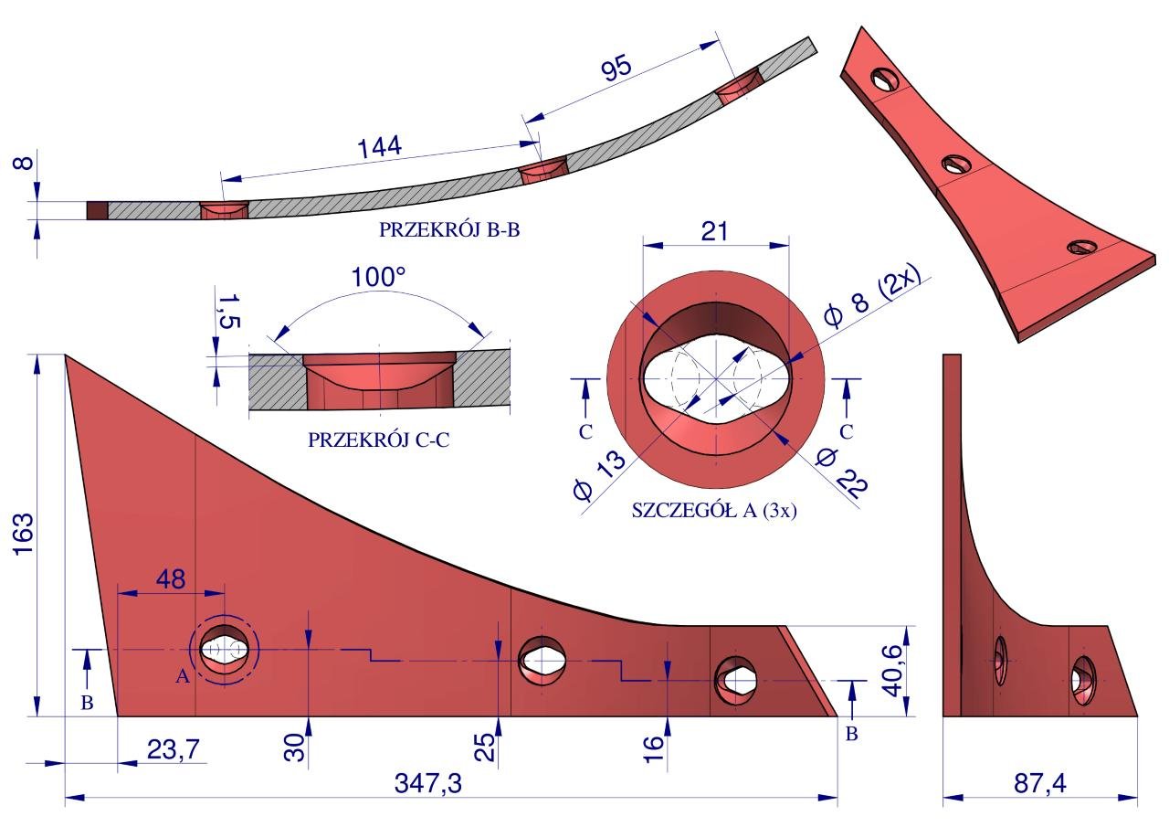 Pierś odkładni lewa trzyotworowa zastosowanie Kverneland stal borowa Waryński