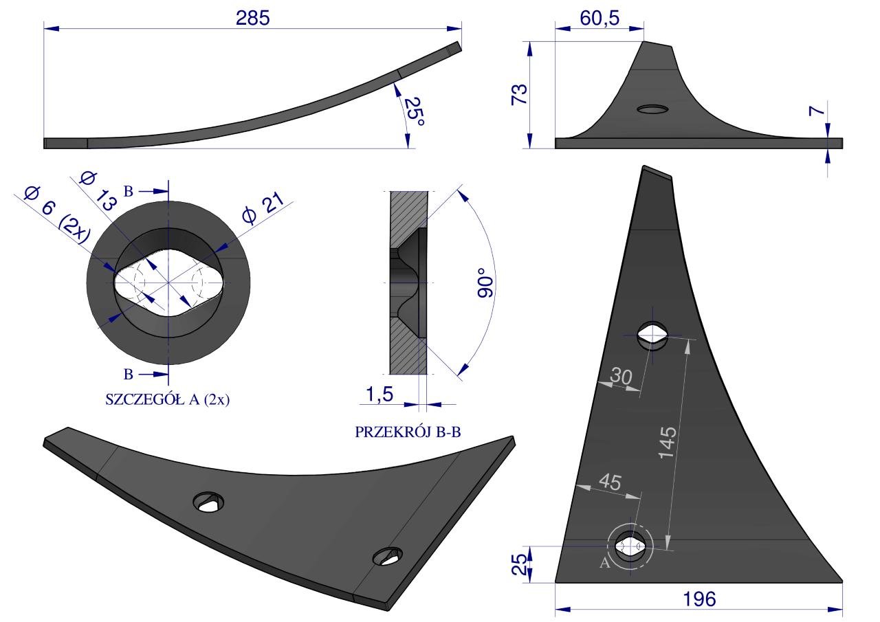 ŚRUBY WSPÓŁPRACUJĄCE:2 x W-173121235Pierś prawa dwuotworowa zastosowanie Kuhn Clasicos WARYŃSKI Części robocze marki WARYŃSKI wykonane są z niezwykle wytrzymałej i odpornej na ścieranie stali borowej pochodzącej z europejskich hut. Każda, nawet najmniejsza dostawa, posiada dołączony certyfikat potwierdzający skład materiałowy. Stal borowa posiada właściwości szczególnie przydatne w zastosowaniach konstrukcyjnych wymagających dużej wytrzymałości. Połączenie wysokogatunkowej stali borowej, monitorowanego procesu obróbki cieplnej oraz skrupulatna kontrola jakości produktów WARYŃSKI to gwarancja wydłużonego okresu eksploatacji. Produkty WARYŃSKI to oszczędność kosztów związanych z powolnym ścieraniem i zużyciem części roboczych. W trosce o trwałość naszych produktów oraz zadowolenie klientów proces produkcji lemieszy WARYŃSKI nie zakłada operacji spawania. Wszystkie rodzaje otworów są wykonane w specjalny sposób minimalizujący naprężenia oraz zmniejszający ryzyko pęknięć.