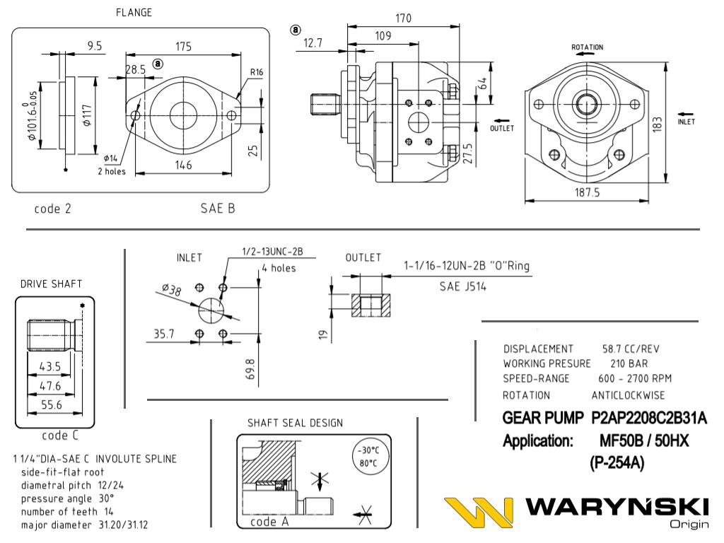 Pompa zębata P-254A P2AP2208C2B31A Koparko-ładowarka Massey Ferguson MF 50B/50HX/50EX Waryński