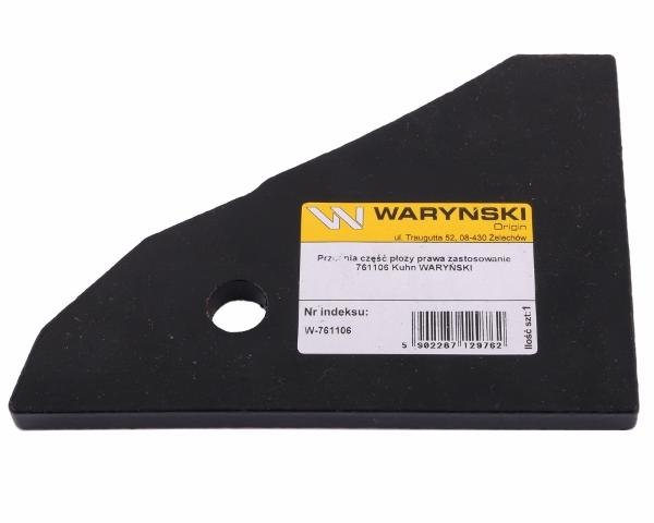 Przednia część płozy prawa zastosowanie 761106 Kuhn stal borowa WARYŃSKI ŚRUBY WSPÓŁPRACUJĄCE:2 x W-712121234 Części robocze marki WARYŃSKI wykonane są z niezwykle wytrzymałej i odpornej na ścieranie stali borowej pochodzącej z europejskich hut. Każda, nawet najmniejsza dostawa, posiada dołączony certyfikat potwierdzający skład materiałowy. Stal borowa posiada właściwości szczególnie przydatne w zastosowaniach konstrukcyjnych wymagających dużej wytrzymałości. Połączenie wysokogatunkowej stali borowej, monitorowanego procesu obróbki cieplnej oraz skrupulatna kontrola jakości produktów WARYŃSKI to gwarancja wydłużonego okresu eksploatacji. Produkty WARYŃSKI to oszczędność kosztów związanych z powolnym ścieraniem i zużyciem części roboczych. W trosce o trwałość naszych produktów oraz zadowolenie klientów proces produkcji lemieszy WARYŃSKI nie zakłada operacji spawania. Wszystkie rodzaje otworów są wykonane w specjalny sposób minimalizujący naprężenia oraz zmniejszający ryzyko pęknięć.