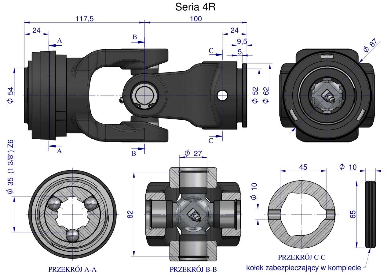 Przegub kompletny z krzyżakiem 27X82 seria 4 do rury wewnętrznej 45mm Waryński [WR274101]