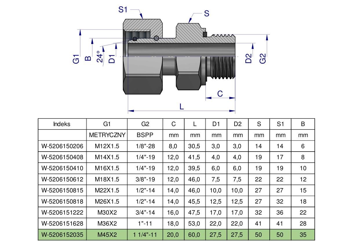 Przyłączka hydrauliczna AB (EVGE) M45x2 35L x 1 1/4″ BSP ED Waryński [W-5206152035]