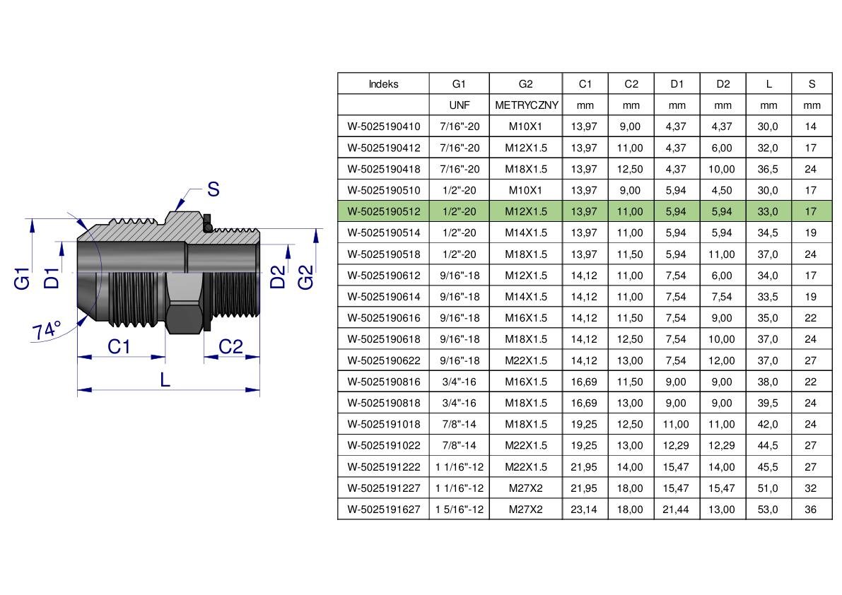 Przyłączka hydrauliczna BB 1/2″UNF (JIC) x M12x1.5 (XGE) Waryński ( sprzedawane po 2 ) [W-5025190512]